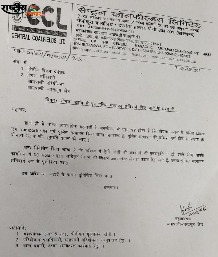 जानकारी के अनुसार, सीसीएल के आम्रपाली–चंद्रगुप्त क्षेत्र के महाप्रबंधक (GM) ने 24 अगस्त 2025 को एक पत्र जारी किया। यह पत्र क्षेत्रीय विक्रय प्रबंधक और प्रेषण अधिकारी को संबोधित था, जिसकी प्रति सीसीएल मुख्यालय,आम्रपाली परियोजना पदाधिकारी,और टंडवा थाना पुलिस को भी भेजी गई थी।
