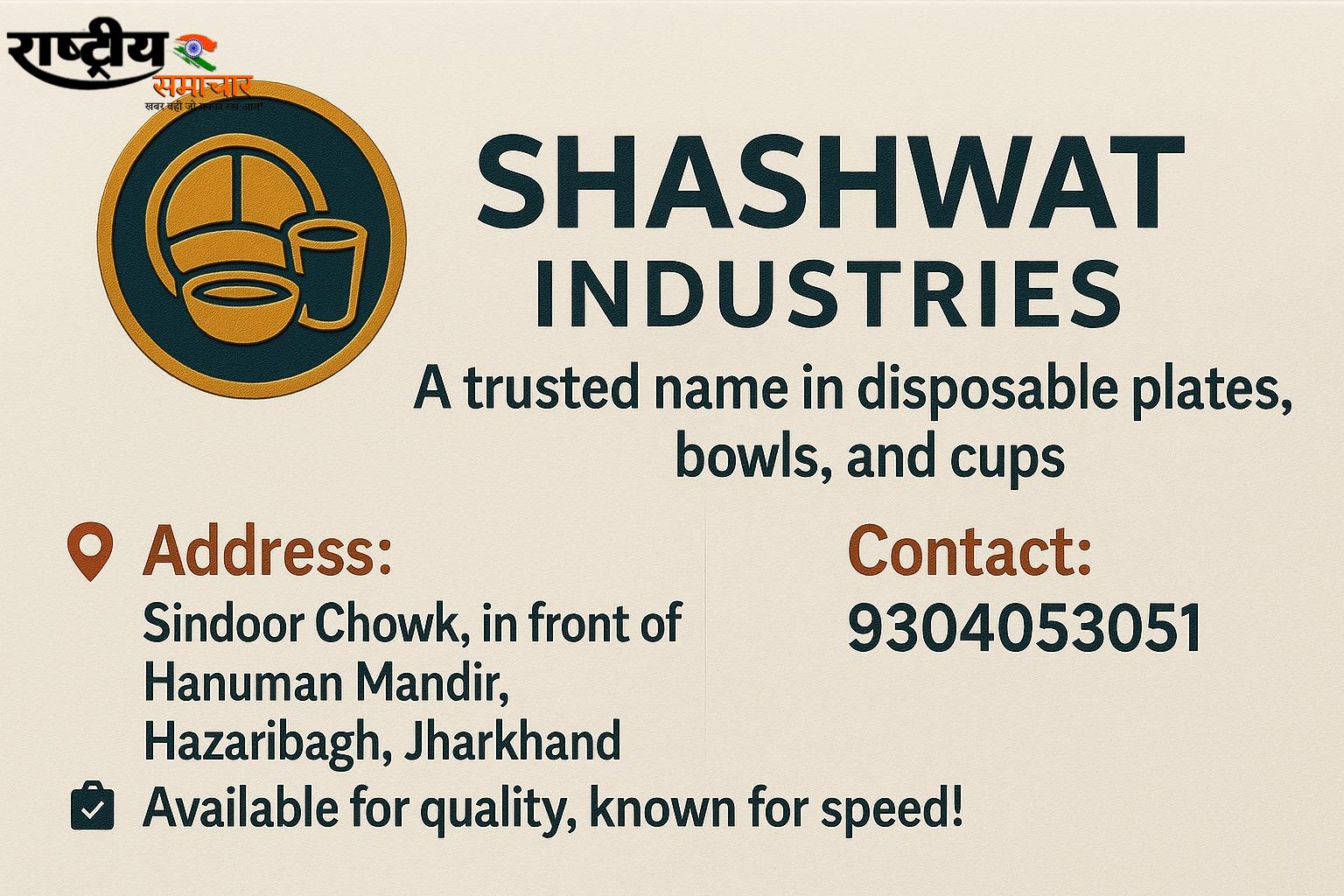 शाश्वत इंडस्ट्रीज की हजारीबाग में भव्य शुरुआत –टिकाऊ डिस्पोजेबल उत्पादों का नया ठिकाना। रिपोर्ट:-आशीष यादव हजारीबाग:बदलते समय के साथ लोगों की जरूरतें भी बदल रही