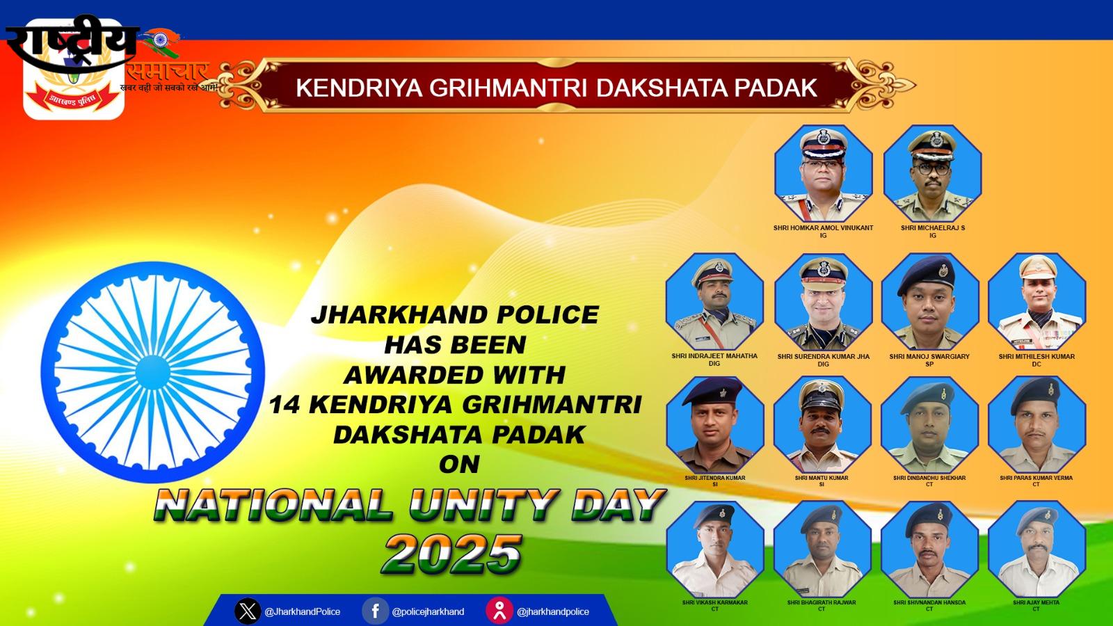 झारखंड पुलिस के 14 अधिकारी-कर्मियों को मिला केंद्रीय गृह मंत्री दक्षता पदक