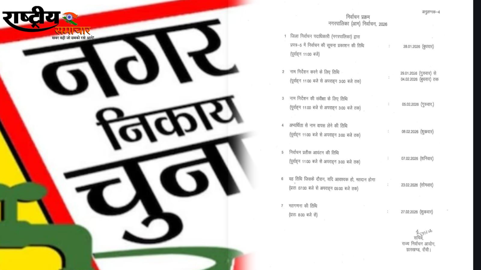 झारखंड में नगर निकाय चुनाव का ऐलान, 23 फरवरी को मतदान रांची : झारखंड में नगर निकाय चुनाव को लेकर राज्य निर्वाचन आयोग ने अधिसूचना