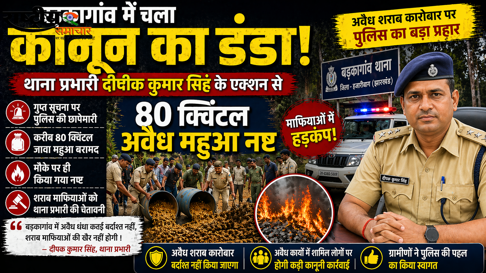बड़कागांव में थाना प्रभारी दीपक कुमार सिंह का बड़ा एक्शन, 80 क्विंटल अवैध महुआ नष्ट
